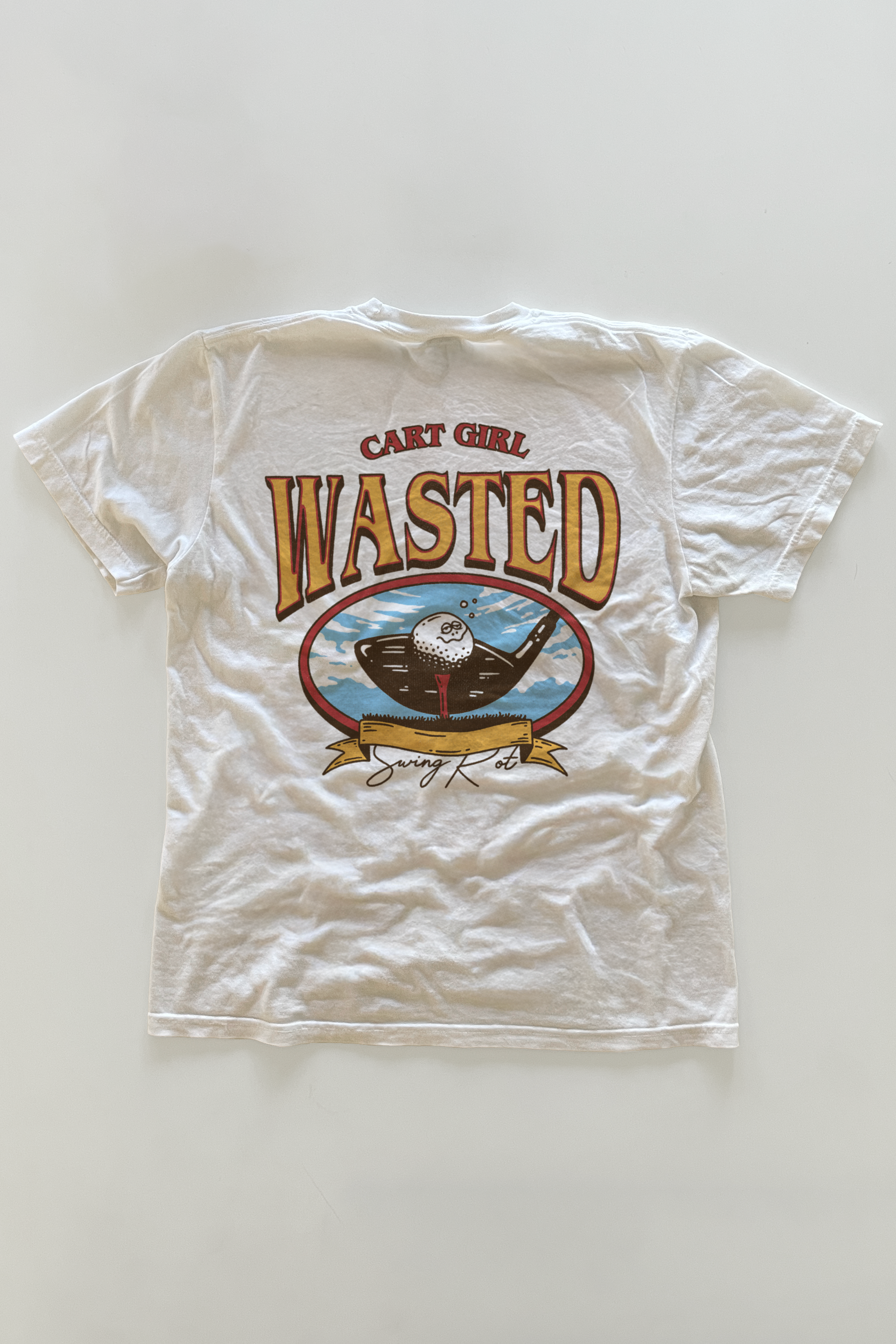 Garment dyed, seamless body crew neck featuring a 'Golf' graphic printed direct to film on the front and back. Unisex sizing, so a looser women's fit.
