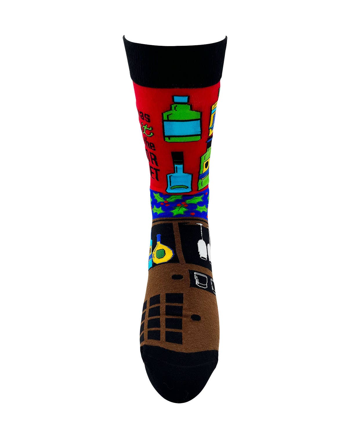 Men's novelty crew socks with saying "My Christmas Spirit is in the Liquor Cabinet."