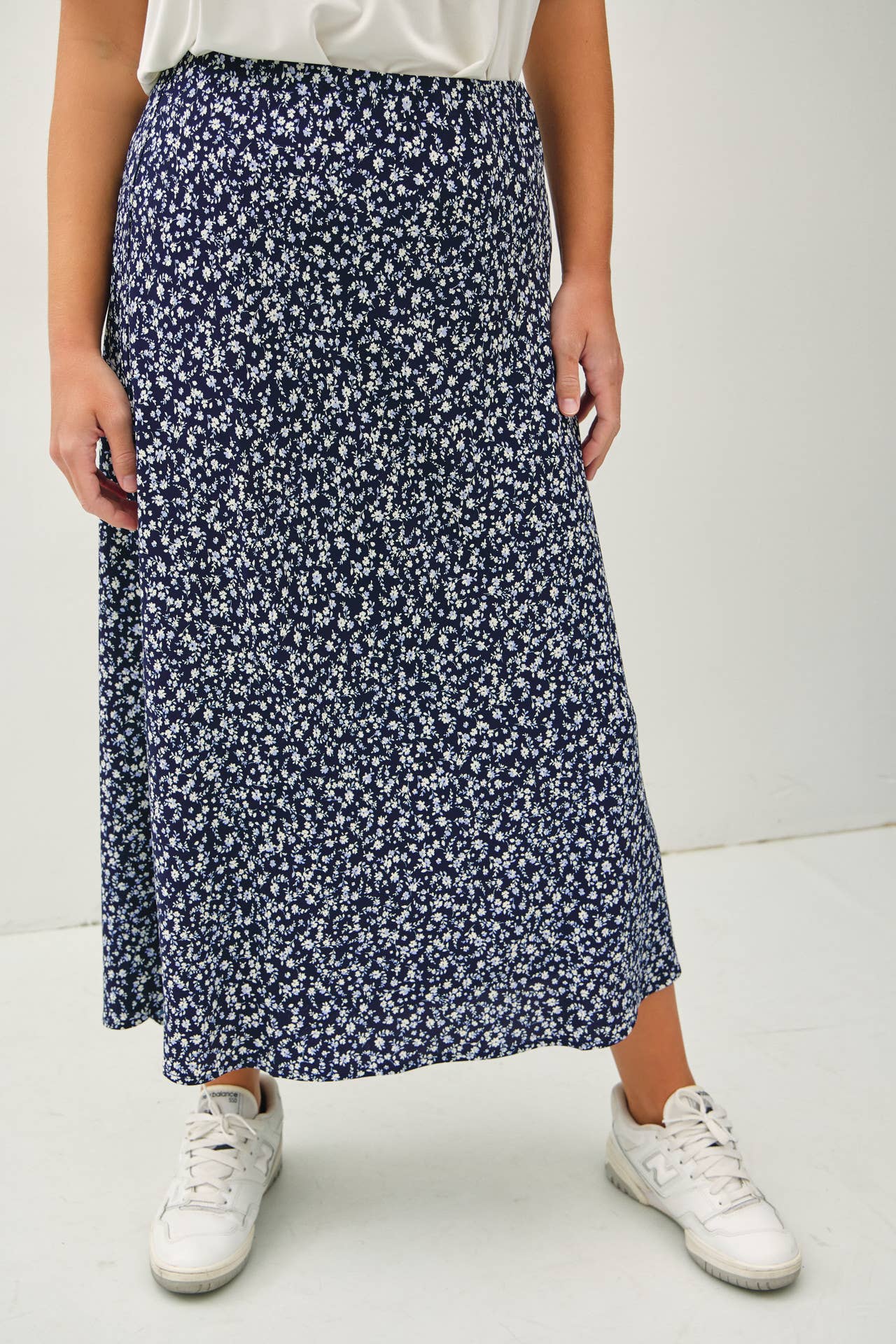 PLUS FLORAL PRINT MIDI SKIRT W/ ELASTIC WAISTBAND