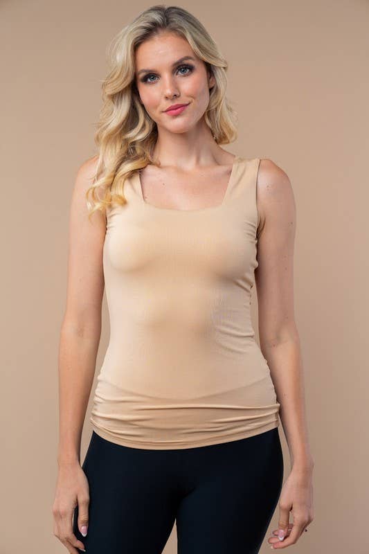 A sleeveless solid knit top with a square neck featuring a true-to-size fit. Fabric is a lightweight buttery soft knit